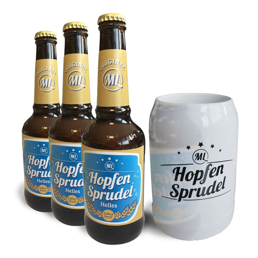 Geschenkset aus 3 Flaschen Helles "Hopfensprudel" 0,33l und Bierkrug 0,5 Liter - Version: "Hopfensprudel" Alc....