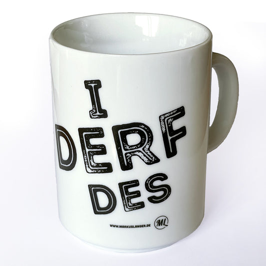 Die Tasse ist bedruckt mit dem boarischen (für nicht Bayern: bayerischen) Spruch: I derf des....