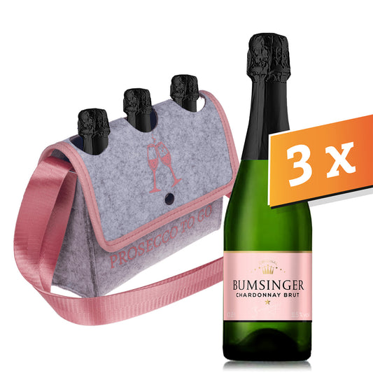 Bumsinger Chardonnay Brut im 3er Set mit praktischer Handtasche "Prosecco to go" aus Filz. Es...