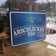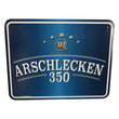 Auf dem geprägten Schild findet sich der bekannte Schriftzug "Arschlecken 350".